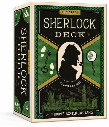 The game is afoot! With this six-in-one set of 60 cards plus rules book, two to six players can become the detectives as they unravel the iconic mysteries of Sherlock Holmes. The Great Sherlock Deck turns the works of Arthur Conan Doyle into a unique 60-card deck based around thirteen well-known Sherlock Holmes mysteries. It's family fun for ages twelve and up so anyone can play. Each of the six card games included in the rules book plays like a classic card game, so it’s easy to get started and join in on the fun. * Play Mysteries, a variant of Go Fish, as you try to collect all the clues for as many of the thirteen mysteries as you can. * Declare It’s Elemental in a variation on crazy eights where you work to get rid of all the cards—and clues—in your hand. * Try the Sherlock Snap, where you play the classic game of snap by matching the same type of clue from different mysteries until someone else is left holding all the cards at the end. * Or play one of your favorite card games—the cards can be used just like a regular deck! Everything you need to play is included in the box, and with six games to choose from there’s always something new to investigate. Join the Baker Street irregulars and get on the case!