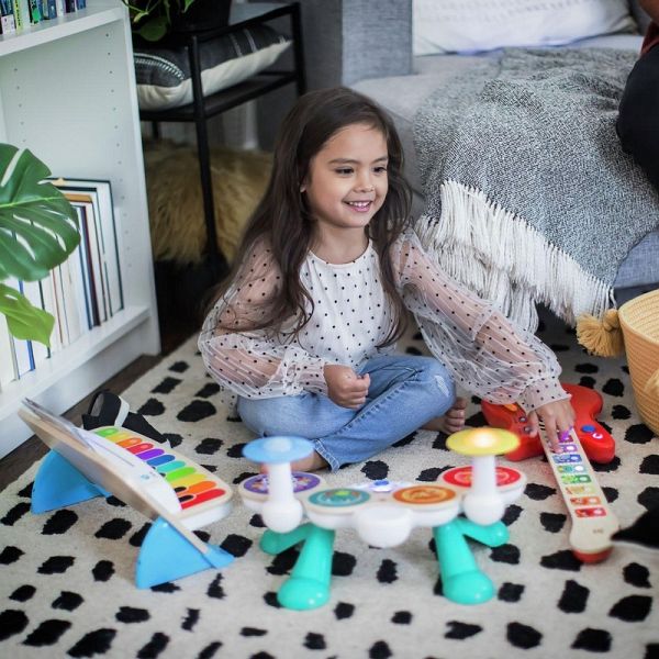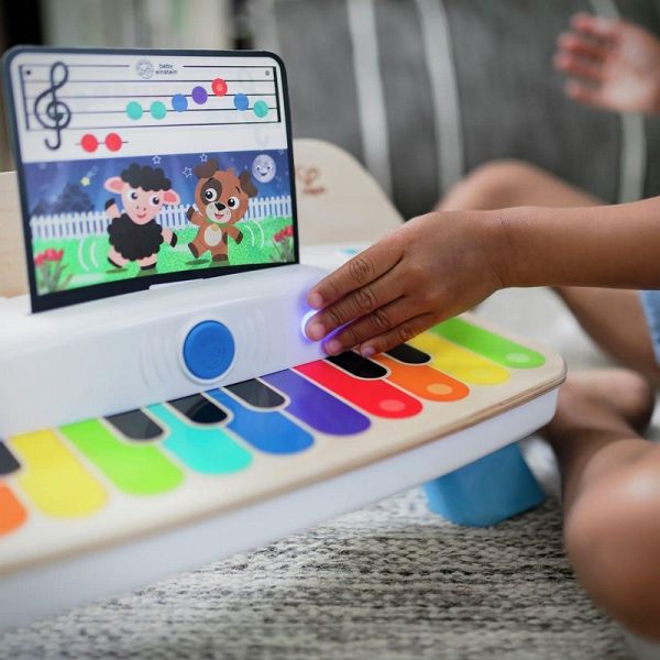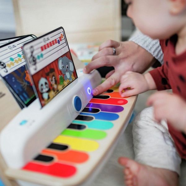 Drücke die "connect?-Taste und spiele mit deiner eigenen Band! Regler für automatische Melodien: bei jeder Tastenberührung wird die richtige Melodie gespielt. Holztastatur mit patentierter Magic TouchTM-Technologie. Ohne Druckfunktion der Tasten - Töne erklingen durch Antippen der farblich markierten Fläche. 3 Spielmodi: Komponieren, Kreatives Spiel und Freies Spiel - für Solos oder Zusammenspiel. Die Instrumente harmonieren auf magische Weise: unabhängig von der Zahl der musizierenden Kinder klingt die Musik immer fantastisch! Informationen zum Funkanlagentyp der Richtlinie 2014/53/EU zum Download hier ACHTUNG: Um die beste Leistung zu erzielen, empfehlen wir, dass Sie Alkali-Batterien verwenden. Bewahren Sie Batterien immer außerhalb der Reichweite von Kindern auf. Verwenden Sie nicht alte und neue Batterien zusammen. Verwenden Sie keine alkalischen, normalen und aufladbaren Batterien zusammen. Nur Batterien des gleichen oder entsprechenden Typs sind zum Gebrauch empfohlen. Setzen Sie die Batterien so ein, dass die Polung im Batteriefach stimmt. Schließen Sie die Batterien nicht kurz. Bewahren Sie die Batterien nicht an Orten mit extremen Temperaturschwankungen auf (z.B. Dachboden, Garage oder Fahrzeuge). Entfernen Sie nicht mehr funktionierende Batterien vom Batteriefach, Versuchen Sie nie, Batterien wieder aufzuladen, außer sie sind mit "aufladbar" bezeichnet. Aufladbare Batterien müssen vor dem Aufladen aus dem Spielzeug genommen werden. Aufladbare Batterien dürfen nur unter der Aufsicht Erwachsener aufgeladen werden. Verwenden Sie keine aufladbaren, alkalischen Batterien in einen Ni-Cad oder Ni-MH Batterieladegerät. Bitte entsorgen Sie die Batterien an dem dafür vorgesehenen Ort. Nehmen Sie die Batterien aus dem Gerät, wenn Sie es längere Zeit nicht verwenden. Entsorgen Sie das Produkt oder die Batterien nicht im Feuer, Batterien könnten explodieren oder auslaufen. PFLEGEHINWEISE: Vor der Benutzung mit einem feuchten Tuch und milder Seife reinigen. An der Luft trocknen lassen. Nicht in Wasser eintauchen. WICHTIG: Entfernen Sie sämtliches Verpackungsmaterial und alle Befestigungselemente, bevor das Produkt von Kindern verwendet wird. Diese Verpackung bitte zur späteren Bezugnahme aufbewahren. Sie enthält wichtige Informationen. Nur innerhalb einer Familie verwenden. Wir nehmen fortlaufend Verbesserungen und Aktualisierungen an unseren Produkten vor. Es kann manchmal vorkommen, dass die Abbildungen auf dieser Verpackung von den darin befindlichen Produkten abweichen.