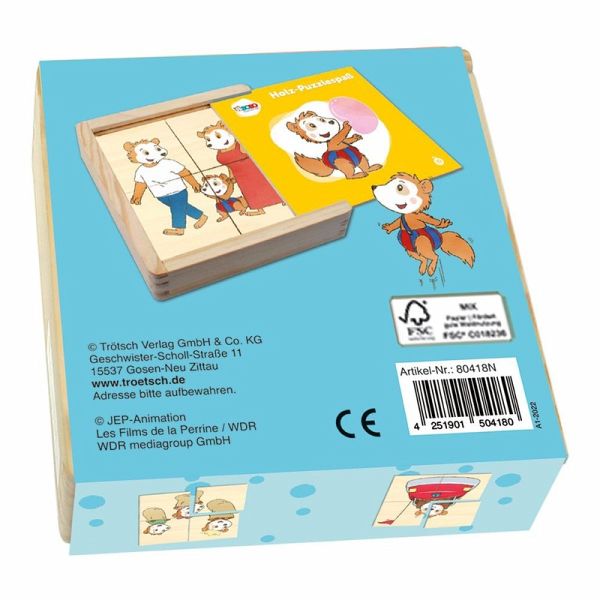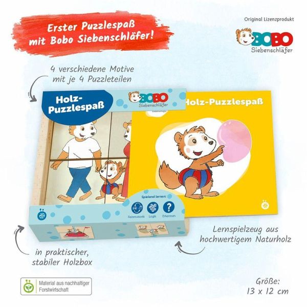 Dieses fröhliche Holzpuzzle von Bobo Siebenschläfer und seinen Lieben ist dank seiner extra großen Puzzleteile ideal für kleine Bobo-Fans! Die vier Motive lassen sich mit je vier Puzzleteilen leicht zusammensetzen und fördern die kognitiven Fähigkeiten der kleinen Puzzler. Ein tolles Beschäftigungsspiel in einer praktischen, stabilen Holzbox.