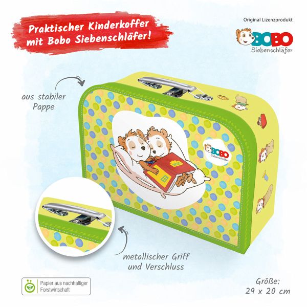 Der große Kinderkoffer von Bobo Siebenschläfer ist bereit für jedes Abenteuer - einfach die liebsten Sachen einpacken und überall mit hinnehmen! Dieser wunderschöne Koffer aus Pappe ist prima geeignet für den Kurzbesuch sowie zum Aufräumen von Spielsachen zu Hause. Ein tolles Geschenk für kleine Bobo-Fans - geeignet für alle Anlässe!