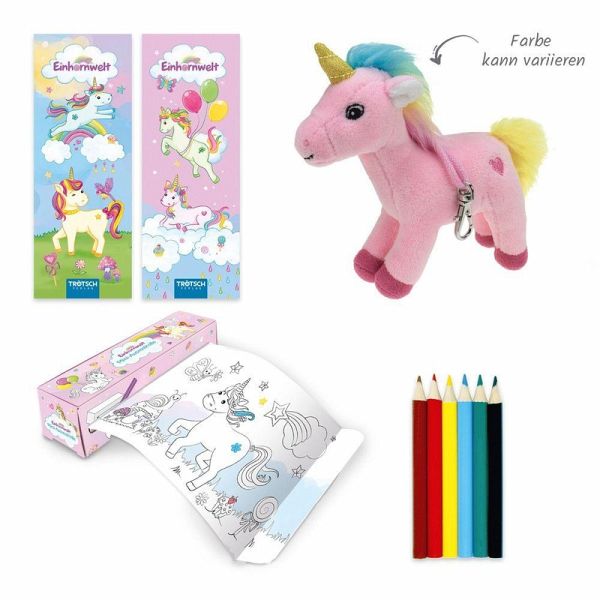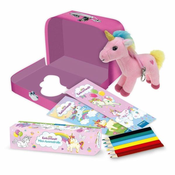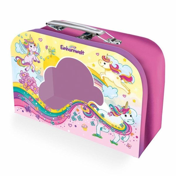 Dieser Kinderkoffer ist gefüllt mit zauberhaftem Inhalt: einem Plüsch-Schlüsselanhänger, einer Malrolle, Buntstiften und zwei Lesezeichen. Der besondere Hingucker: die pinkfarbene Funkelfolie! Durch das Fenster im Deckel kann man ins Innere des Koffers schauen. Ein tolles Geschenk für kleine Einhorn-Fans!