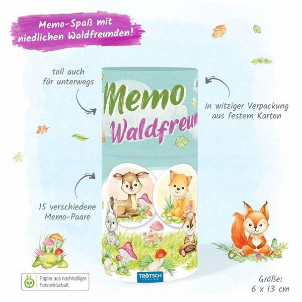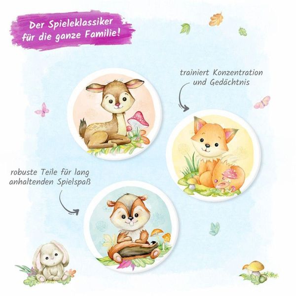 Wem gelingt es, die meisten Paare zu finden und auszulegen? Die drolligen Waldtiere sorgen mit diesem Memospiel für Spannung und Spaß!