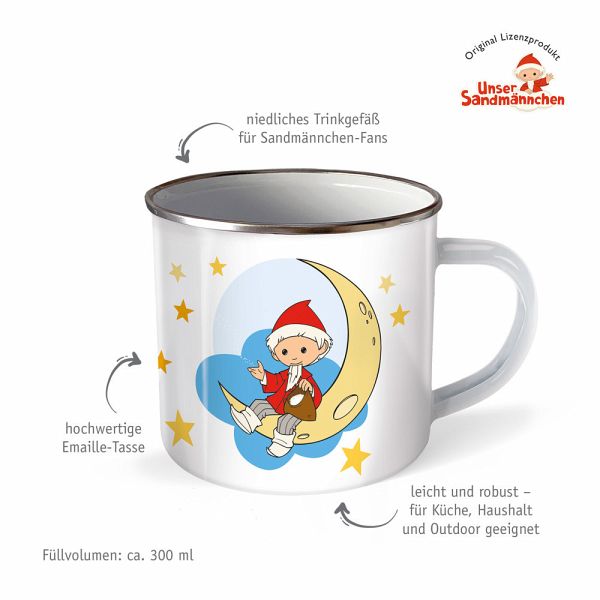 Ob Kindergarten, Camping oder Picknick unterwegs - die robuste Emailletasse mit dem Sandmännchen kommt überall mit hin! Mit ihrem Fassungsvermögen von ca. 300 ml hat sie die perfekte Größe für einen Tee oder Kakao und ihr hübsches Design mit der klassischen Tassenform machen sie zu einem echten Blickfang. Eine tolle Geschenkidee für alle Sandmännchen-Fans!