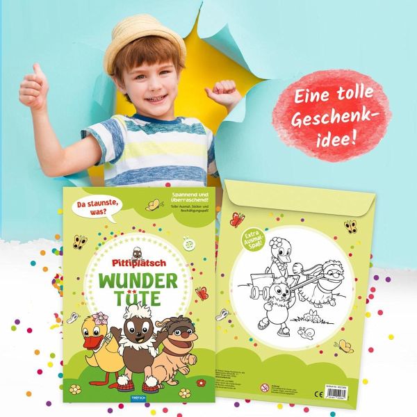 Pitti und seine Freunde lieben Überraschungen, deshalb haben sie diese Wundertüte mit tollen Pittiplatsch-Produkten zusammengestellt! Die Wundertüte enthält ein Mal- und Beschäftigungsbuch, einen Bogen mit fröhlichen Stickern sowie eine weitere Überraschung. Das perfekte Geschenk für Geburtstage, zur Einschulung oder als außergewöhnliches Party-Mitbringsel! Ideal für Kinder zwischen drei und sechs Jahren. Die Wundertüte besteht der Umwelt zuliebe aus Papier und als Bonus gibt es ein Bild zum Ausmalen auf der Rückseite. Der Inhalt kann variieren.