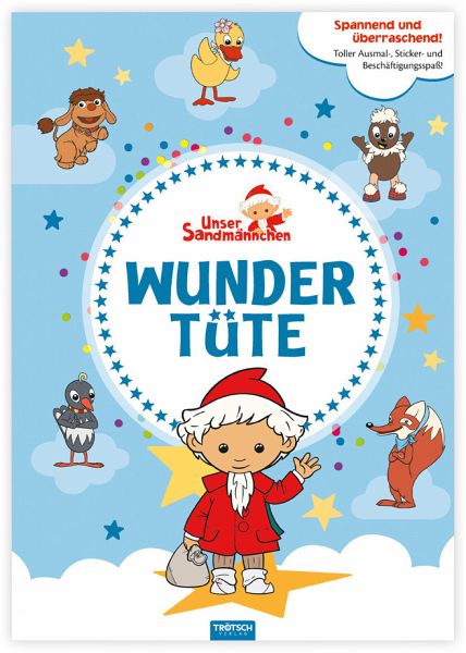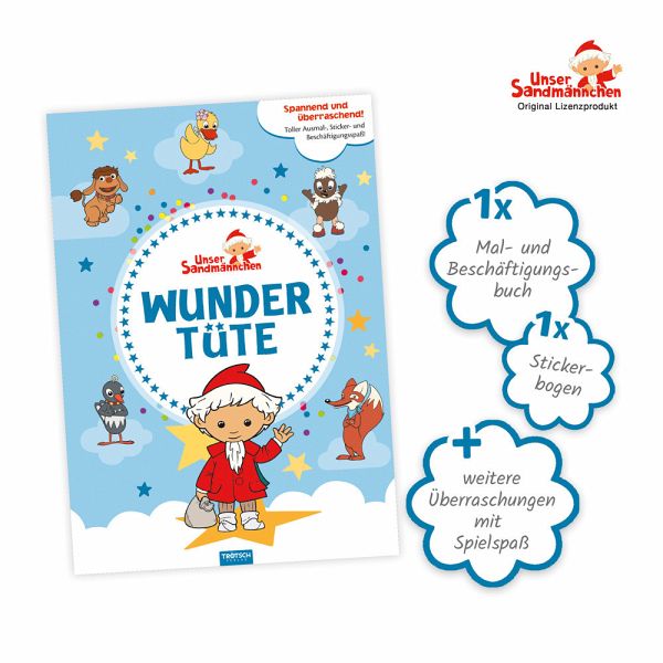 Das Sandmännchen und seine Freunde lieben Überraschungen, deshalb haben sie diese Wundertüte mit tollen Produkten zusammengestellt! Die Wundertüte enthält ein Mal- und Beschäftigungsbuch, einen Stickerbogen sowie zwei weitere Überraschungen. Das besondere Geschenk für Kinder von 3 bis 6 Jahren - geeignet für Geburtstage, die Einschulung oder als Mitbringsel.
