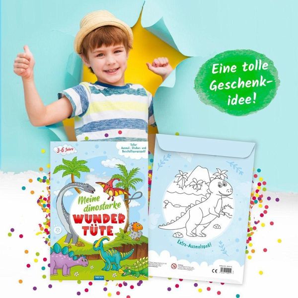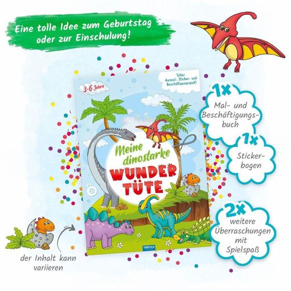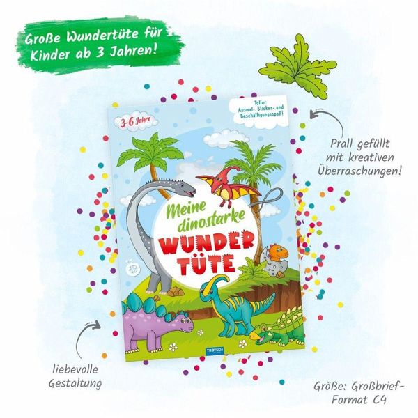 In dieser Wundertüte steckt so einiges, was Dino-Fans begeistert: z. B. ein Mal- und Beschäftigungsbuch, ein Bogen mit fröhlichen Stickern und weitere Dino-starke Überraschungen.