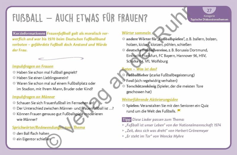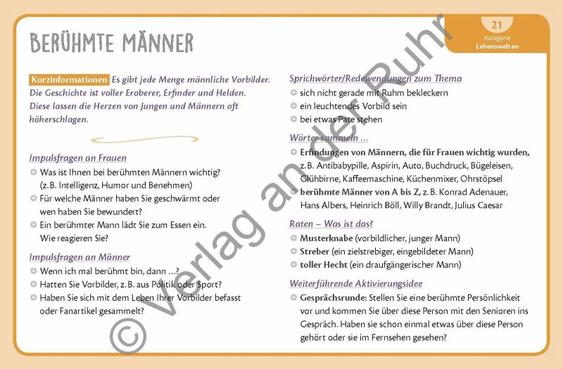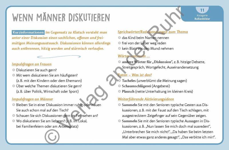 Erzählspiel für die genderspezifische Biografiearbeit mit Senioren und Seniorinnen, für Fachkräfte in Altenpflege und Seniorenarbeit +++ Wie verhalten sich typischerweise Frauen und Männer? Und was bedeutet es eigentlich, eine Frau oder ein Mann zu sein? Gibt es die typische Frau und den typischen Mann überhaupt? Dieses Kartenset ist ein Erzählspiel für die genderspezifische Biografiearbeit mit Senioren mit und ohne Demenz und stellt u. a. diese Fragen zur Diskussion. Die 64 Karten beinhalten sechs Kategorien mit Themen, die die Frauen- und Männerwelt besonders bewegen: "Aussehen und Kleidung", "Lebensstile", "Rollenbilder", "Lebenswelten", "Typische Diskussionsthemen" und "Benimmregeln". Zu jeder Kategorie gehören fünf bis sechs verschiedene Bereiche mit Impulsfragen und weiterführenden Aktivierungsideen: von Frauen, die tratschen, und Männern, die diskutieren, über berufstätige Frauen und Männer bis hin zu der Frage, wie sich Männer und Frauen bei der ersten Verabredung verhalten sollten. Zu jedem Thema gibt es jeweils eine spezielle Frauen- und Männer-Karte, die die Geschlechterinteressen besonders in den Vordergrund stellen. Auf jeder Kartenvorderseite finden Sie ein ansprechendes Foto als Gesprächsaufhänger. Ob in der Gruppe oder Einzelbetreuung: Mit diesem Kartenspiel-Set kommen Ihre Senioren angeregt ins Gespräch, werden Erinnerungen aktiviert und es wird ganz bestimmt auch hin und wieder heiß diskutiert. Aber vor allem stärken Sie mit diesem Spiel die Identität Ihrer Senioren als Frau und Mann!