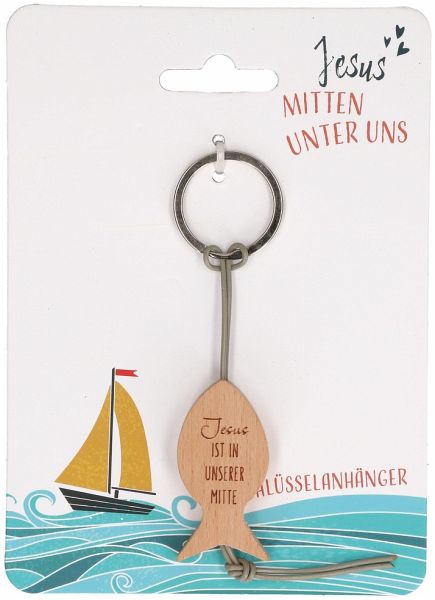 Der Schlüsselanhänger ist durch die feine Gravur "Und Jesus mitten unter uns" und das naturbelassene Material ein vertrauensvoller und einzigartiger Begleiter.Ein kleines Accessoire, das sich prima als individuelles Geschenk für einen lieben Menschen eignet und durch die nachhaltigen Materialien Holz und Leder einen modernen Look widerspiegelt. Die hellgraue Rindsleder-Schnur verbindet den Fisch spielerisch mit dem wertigen Ring aus Metall, der für jeden Schlüsselbund geeignet ist.