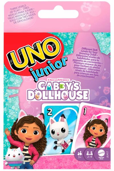 Das UNO Junior Gabby's Dollhouse Kartenspiel verspricht Spaß auf vier Pfoten! Die Karten mit niedlichen Grafiken sind von Gabby, Pandy Paws und anderen Lieblingscharakteren der Serie inspiriert. Ziel des Spiels ist es auch hier, passende Farben und Zahlen zu finden. Das Spiel bietet drei Schwierigkeitsstufen (Anfänger, Fortgeschrittene und Profis), damit jedes Kind vollen Spielspaß erleben kann. Und natürlich dürfen die Spieler nicht vergessen, laut UNO!" zu rufen, wenn sie nur noch eine Karte auf der Hand haben! Ein tolles Geschenk für Fans von Gabby's Dollhouse und Liebhaber von Kartenspielen ab 3 Jahren. Abweichungen in Farbe und Gestaltung vorbehalten.