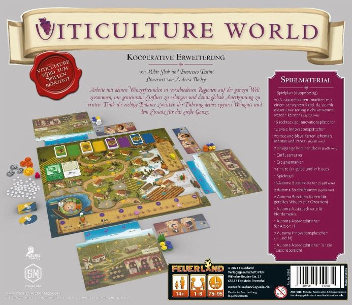 Kooperative Erweiterung zum Spiel Viticulture. Viticulture World ist eine kooperative Erweiterung, in der ihr zusammenarbeiten müsst um gemeinsam Einfluss und globale Anerkennung für eure Weinbauregion zu gewinnen. 7 einzigartige Kontinentdecks versprechen viel Abwechslung. Das Grundspiel Viticulture wird zum Spielen benötigt.