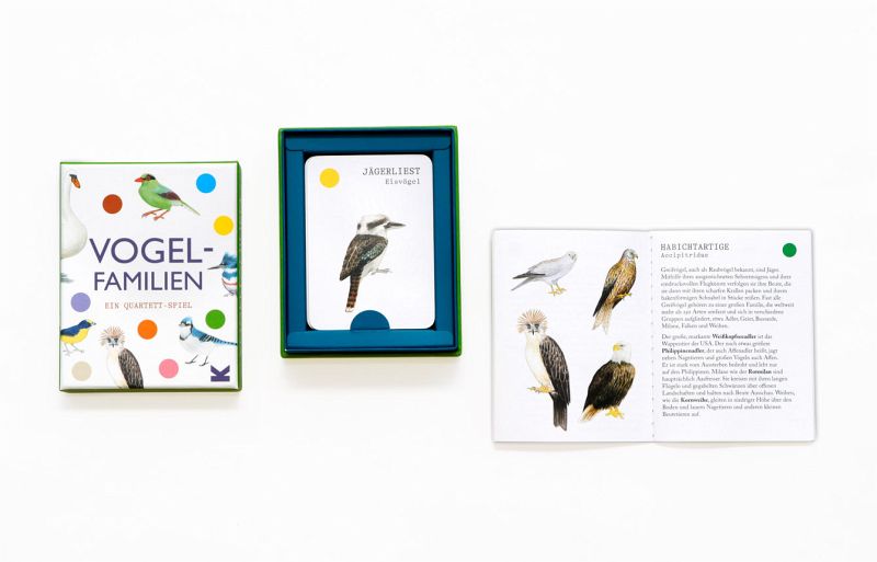 -Vögel sind ein überaus beliebtes Thema, wie unsere Erfolgstitel Vogelpaare und Vogel-Bingo beweisen-Klassisches Quartett, leicht zu verstehen, wunderschön illustriert-Booklet enthält jede Menge Wissenswertes zu den VogelfamilienWussten Sie, dass Jägerlieste zur Familie der Eisvögel gehören? In diesem klassischen Quartett müssen Sie so viele Vierer-Sets wie möglich sammeln. Während Sie also vier Finken, vier Papageien oder vier Spechte von Ihren Mitspielenden erfragen, können Sie die Vielfalt der Farben und Gefieder aus aller Welt bewundern. Spielspaß für die ganze Familie!