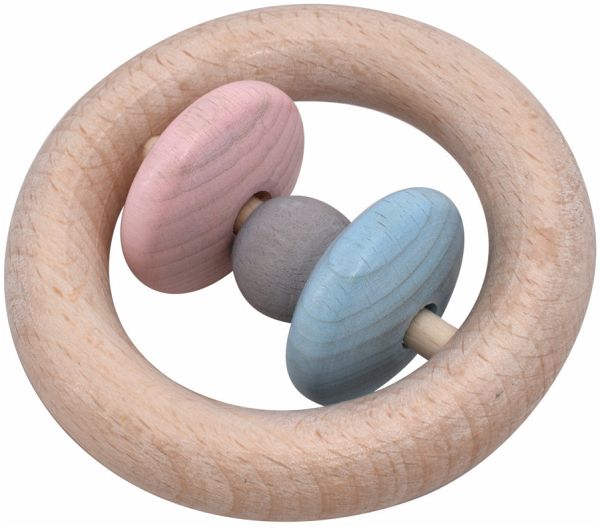Klapper-Ring Roti (blau/rosa)Der Klassiker in neuem Gewand! Die helle Färbung und glatte Oberfläche des Klapper-Rings erfreuen beim Schütteln Kinderaugen und Kinderhände. Aber das Beste kommt noch: der Klang! Das sanfte Klappern und Rattern ist ideal für kleine empfindliche Ohren geeignet !Buchenholz, in Deutschland gefertigtAb 6 Monate Maße: Durchmesser ca. 8,5 cm