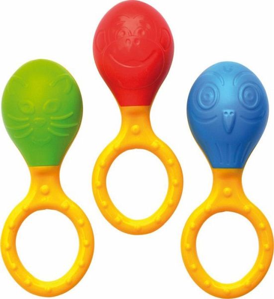 Egal ob man eine oder zwei Maracitos schüttelt: Hier können die Kleinen ihrem Rhythmus freien Lauf lassen. Mit den lustigen Tiergesichtern macht das Ganze noch mehr Spaß. Durch den runden Haltegriff mit erhabenen Pünktchen lassen sich die strapazierfähigen Instrumente leicht greifen und sind optimal für kleine Kinderhände geeignet. Ab 3 Monate Länge: ca. 12,5 cm, Farbänderungen vorbehalten