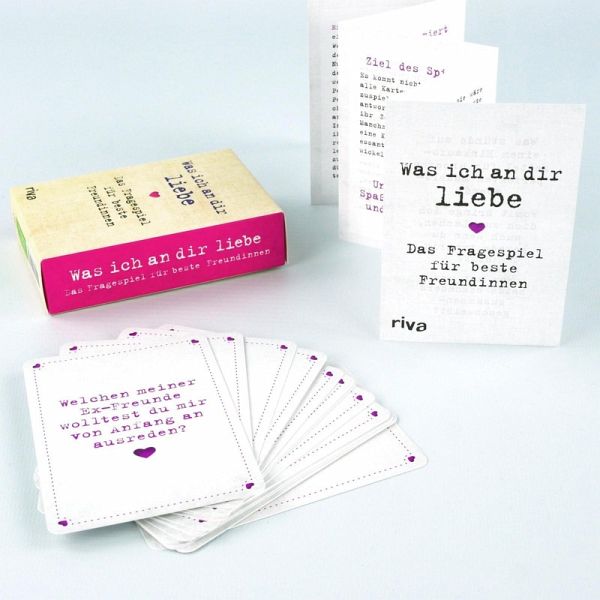 Mit wem sollte ich deiner Meinung nach zusammen sein? Was ist unsere größte Gemeinsamkeit?Der besten Freundin erzählt man alles, man kennt ihre Geheimnisse, erträgt ihre Macken und teilt ihren Humor. Doch heißt »alles« auch wirklich alles?Mit den 64 Fragen dieses Kartenspiels könnt ihr innige und unterhaltsame Momente mit eurer besten Freundin erleben und sie noch mal von einer ganz neuen Seite kennenlernen.Mehr Informationen und weitere tolle Produkte zum Bestseller »Was ich an dir liebe« von Alexandra Reinwarth gibt es unter: www.was-ich-an-dir-liebe.de