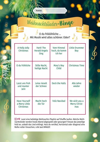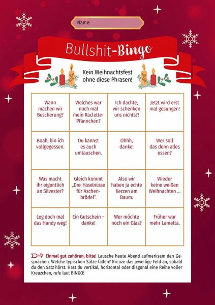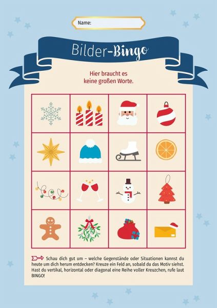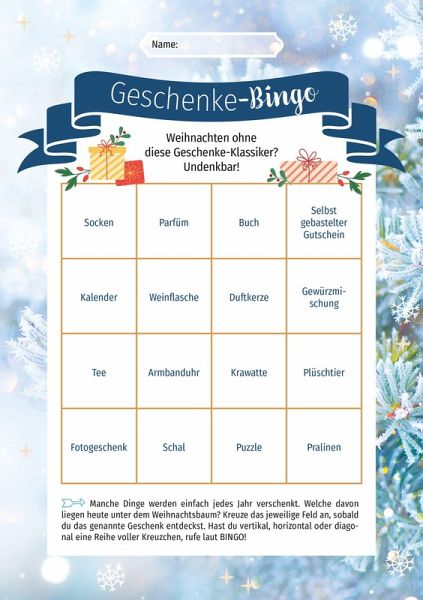 Der Spieleblock beinhaltet 50 Vorlagen mit 7 unterschiedlichen Spielformen wie dem "Bullshit-Bingo", einem "Foto-Bingo", dem "Geschenke-Bingo" und vielem mehr. Die Gäste können sofort loslegen, denn das Spiel benötigt keinerlei Vorbereitung. So kann man die Zeit vor und nach der Bescherung unterhaltsam überbrücken, miteinander ins Gespräch kommen oder einfach nur zusammen rumalbern.