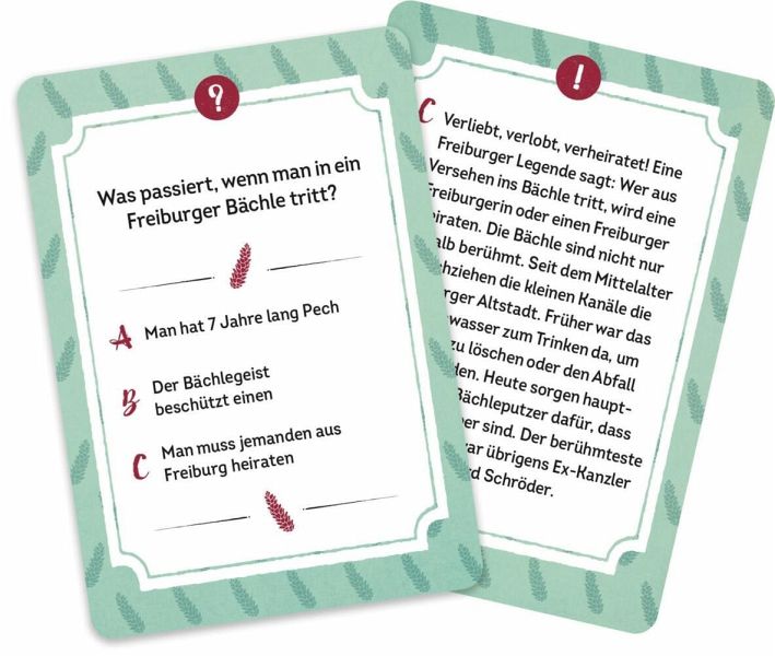 Dieses Quiz ist eine unterhaltsame Wissensreise durch den Schwarzwald. Die 50 Karten enthalten verblüffende, spannende und lustige Multiple-Choice-Fragen rund um den Schwarzwald - von Freiburg bis Baden-Baden. Tauchen Sie ein in historische Kuriositäten, lernen Sie lokale Persönlichkeiten wie den Offenburger Hermann Schilli kennen und entdecken Sie besondere Sehenswürdigkeiten und Bauwerken wie die Hexenlochmühle. Auf den Rückseiten finden Sie nicht nur die richtige Antwort, sondern auch interessante Fakten und Hintergrundinfos.
