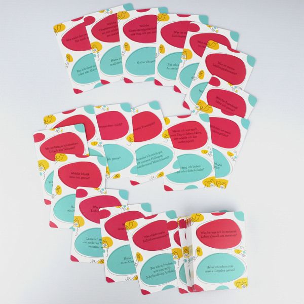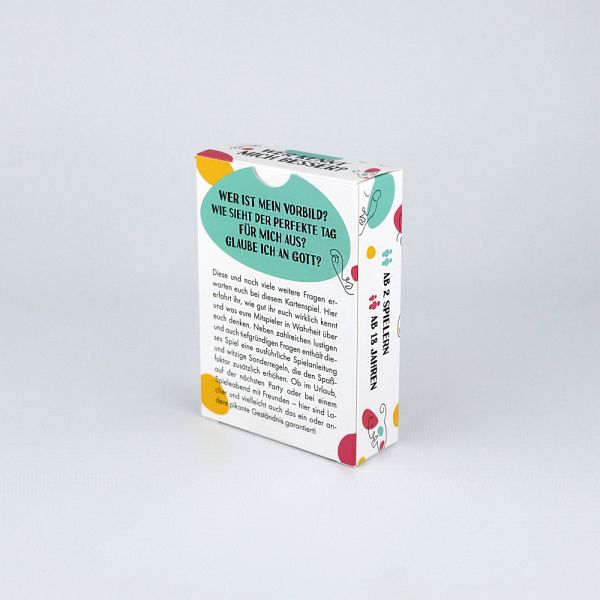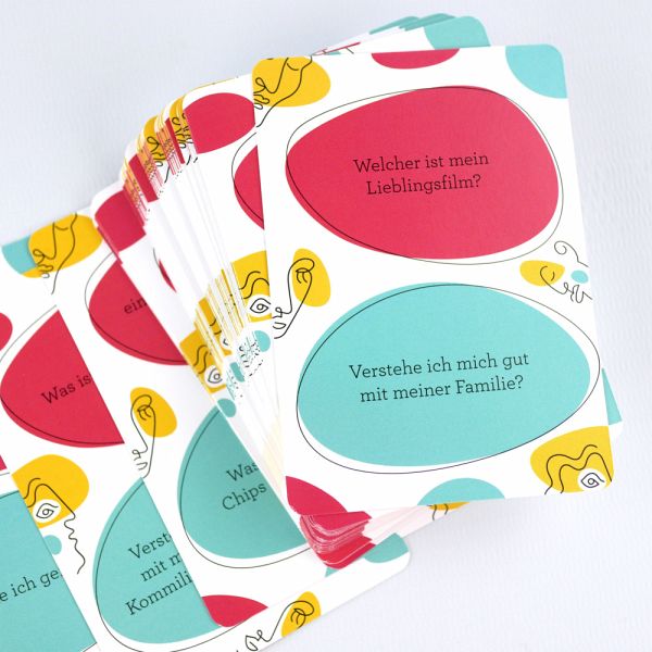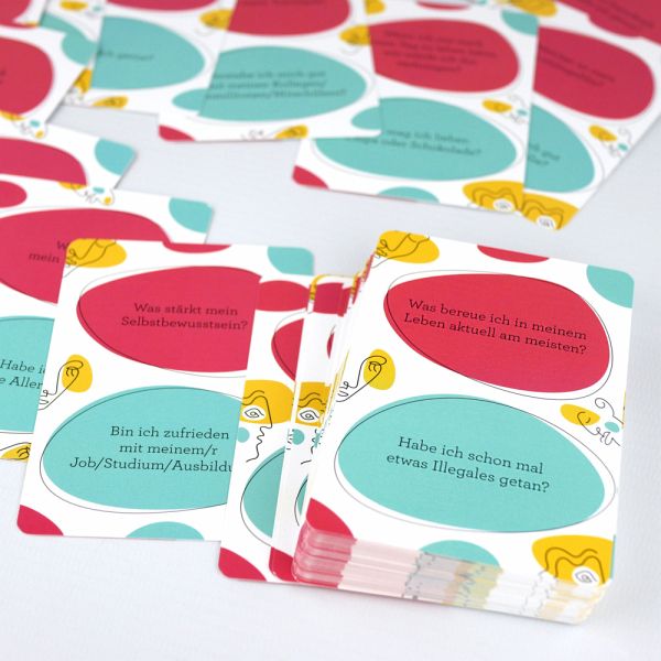 Wer ist mein Vorbild? Wie sieht der perfekte Tag für mich aus? Glaube ich an Gott?Diese und noch viele weitere Fragen erwarten euch bei diesem Kartenspiel. Hier erfahrt ihr, wie gut ihr euch wirklich kennt und was eure Mitspieler in Wahrheit über euch denken. Neben zahlreichen lustigen und auch tiefgründigen Fragen enthält dieses Spiel eine ausführliche Spielanleitung und witzige Sonderregeln, die den Spaßfaktor zusätzlich erhöhen. Ob im Urlaub, auf der nächsten Party oder bei einem Spieleabend mit Freunden - hier sind Lacher und vielleicht auch das ein oder andere pikante Geständnis garantiert!