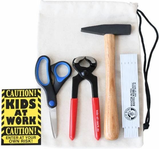 Kinder-Werkzeugset bestehend aus Hammer, Zwickzange, Meterstab und Schere perfekt abgestimmt auf kleine Kinderhände. Inklusive praktischem Baumwollbeutel zur Aufbewahrung und einer Postkarte zum Markieren der "Kinderbaustelle". Ideal für erste handwerkliche Abenteuer!