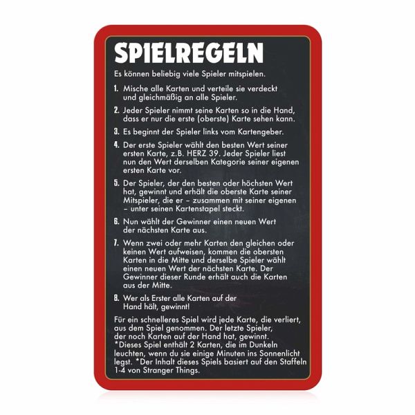 Wenn du nicht nur Karten- oder Brettspiele magst, sondern auch die Schattenwelt liebst, ist dieses Stranger Things Top Trumps Collectable genau das Richtige für dich! Passend zu anderem Stranger Things Merchandise, wie Bücher oder ein Demogorgon Plüschtier, kannst du nun die Hauptcharaktere wie Eleven, Steve Harrington oder dem unheimlichen Vecna und Gedankenschinder gegeneinander antreten lassen. Bilde deinen eigenen Hellfire Club mit diesem großartigen Stranger Things Kartenspiel für zwei oder mehr Spieler.