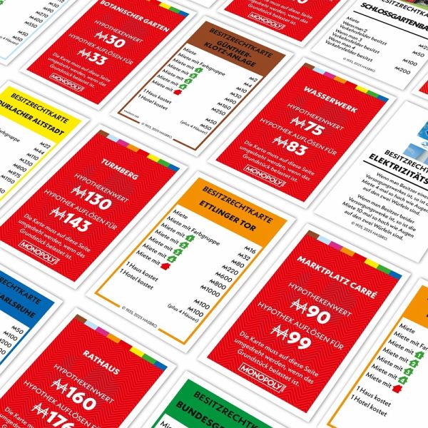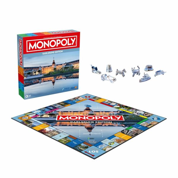 Zwischen Schlossgarten, Fächerstadt-Flair und Technologiehochburg - Karlsruhe hat viele Gesichter! Mit der MONOPOLY Karlsruhe Edition kannst du die badische Metropole auf eine ganz neue Art entdecken. Ob das Karlsruher Schloss, der belebte Marktplatz oder das renommierte Zentrum für Kunst und Medien (ZKM) - jetzt hast du die Chance, deine Lieblingsorte zu besitzen und dein eigenes Stadtreich aufzubauen. Ziehe mit deiner Spielfigur durch die Straßen der Fächerstadt, sichere dir bekannte Sehenswürdigkeiten, Unternehmen und Kulturorte, baue Häuser und Hotels und bring deine Mitspieler mit cleveren Strategien ins Hintertreffen. Von Wissenschaft bis Lebensqualität - Karlsruhe bietet alles, was ein spannendes Spiel braucht. Die eigens für Karlsruhe gestalteten Ereignis- und Gemeinschaftskarten sorgen für spielerische Überraschungen mit echtem Stadterlebnis-Faktor. Also: Figur aussuchen, Würfel schnappen - und los geht deine ganz persönliche Tour durch Karlsruhe!