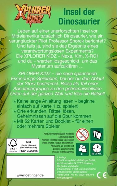 inem für Kinder ab 9 Jahren. Innovativ: Das Kartenspiel führt mit 52 Karten auf eine spannende Dinosaurierjagd und bietet großen Rätsel- und Entdeckerspaß für Fans von Escape-Room-Spielen und Abenteuergeschichten. Interaktiv: Die Spielenden bestimmen den Spielverlauf selbst und machen jede Partie zu einem einzigartigen Abenteuer. Lesen und Spielen in einem: Das Konzept des "gamifizierten Lesens" regt auch Wenigleser_innen zum Mitmachen an. Das interaktive Dinosaurier-Spiel ist eine geniale Mischung aus Quest-Büchern und Escape-Room-Spielen. Hier geht es nicht darum, aus einem Raum zu entkommen, sondern eine spannende Welt zu erkunden und Rätsel zu lösen, die eng mit der Geschichte verknüpft sind. Die innovative Kombination aus Lesen und Spielen ist ein großer Spaß für leseungeübte und lesefaule Kinder ab 9 Jahren.