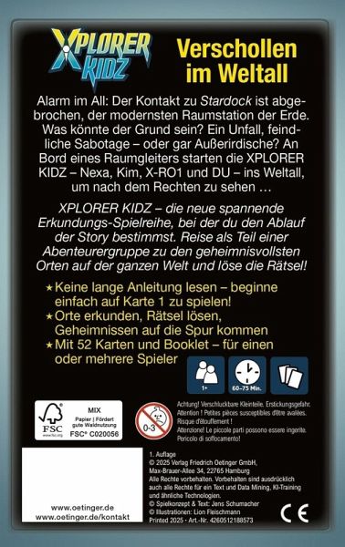 Für die Xplorer Kidz geht es in diesem neuen Abenteuer in unendliche Weiten! Flieg mit Nexa, Kim und ihrem Roboter ins Weltall und finde heraus, was auf der Raumstation "Stardock" geschehen ist. Mach diese Geschichte zu deiner eigenen, löse die Rätsel und werde Teil der Xplorer Kidz! In diesem interaktiven Spielabenteuer werden die Mitspielenden auf 52 Karten durch eine spannende Geschichte geführt. Gemeinsam mit den Xplorer Kidz reisen die Kinder an geheimnisvolle Orte, erforschen Schauplätze wie Geisterhäuser oder Pyramiden und entscheiden selbst, welchen Weg sie gehen oder welche Tür sie öffnen wollen.