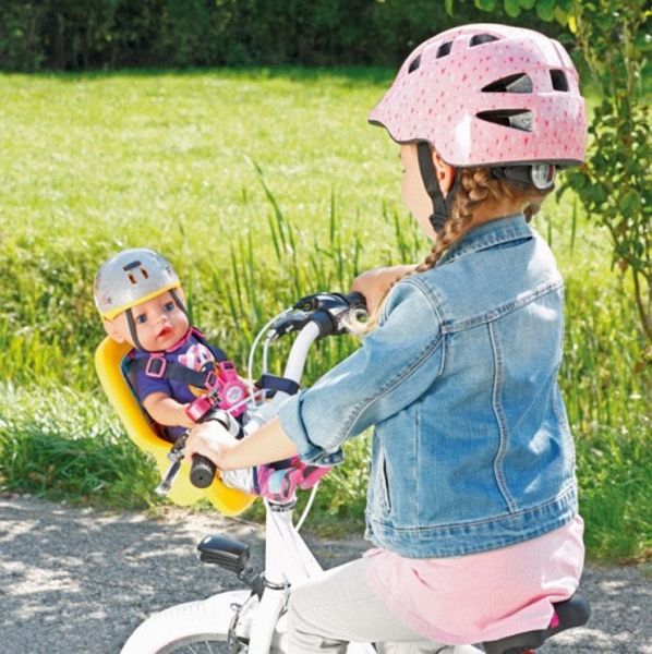 'BABY born fährt zwar schon fleißig mit ihrem Fahrrad mit Stützrädern, aber längere Touren machen die kurzen Beinchen noch nicht mit. Dann fährt die kleine Weltenbummlerin im Fahrradsitz bei den Großen mit. Die bequeme Sitzfläche des ergonomisch geformten Sitzes ist mit geometrischen Mustern bedruckt. Dank des Gurtsystems radelt BABY born während der Tour immer stabil, auch wenn s mal schaukelt und hoppelt. Der Sitz an sich kann mit den Klettriemen am Lenker diverser Kinderfahrräder befestigt werden. Los geht s! Hochwertiges Zubehör für die BABY born Markenspielpuppe. Für erweitertes, abwechslungsreiches und langanhaltendes Spielvergnügen. Auch für kleinere Puppen geeignet. BABY born Fahrradsitz 43cm mit Gurtsystem.