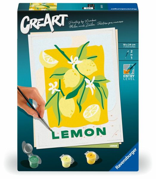 Coole Motive, leuchtende Farben und glänzender Lack für ein perfektes Finish. Das trendige Motiv Zitronen sorgt für großartigen Malspaß für Erwachsene ab 12 Jahren. Die Motivlinien sind bereits aufgedruckt und nummeriert und werden mit den fertig gemischten Acrylfarben ausgemalt. Das ist Malspaß mit Erfolgsgarantie für einen einzigartigen Wandschmuck. So einfach war malen noch nie! Mit CreArt - Malen nach Zahlen von Ravensburger den Weg zur inneren Ruhe und Entspannung finden. Einfach auspacken und los malen: jedes Malset enthält alles, was zum Malen benötigt wird und es ist kein Mischen der Farben notwendig. Das fertig gemalte Bild eignet sich als trendige Dekoration in jedem Zuhause. Das Ravensburger CreArt - Malen nach Zahlen Programm bietet eine große Motivauswahl für Kinder und Erwachsene.