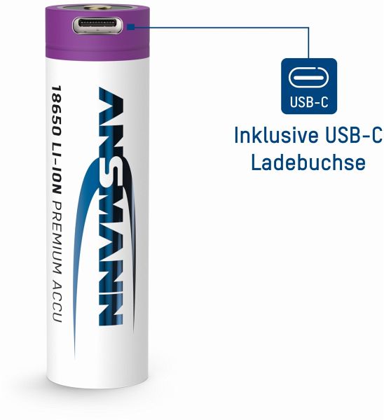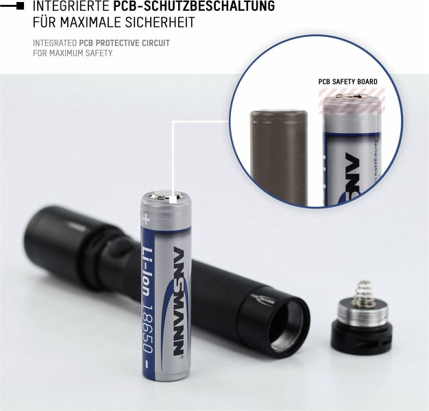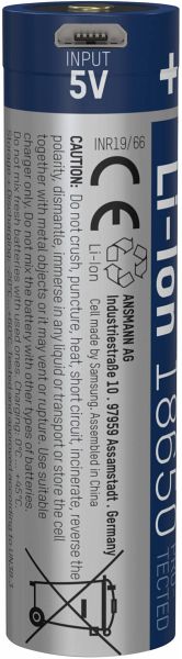 - Hochwertige ANSMANN Lithium Batterie 18650 mit Safety Board und integrierter Micro-USB Ladebuchse. Der Ladestrom wird intern auf max. 1A begrenzt.