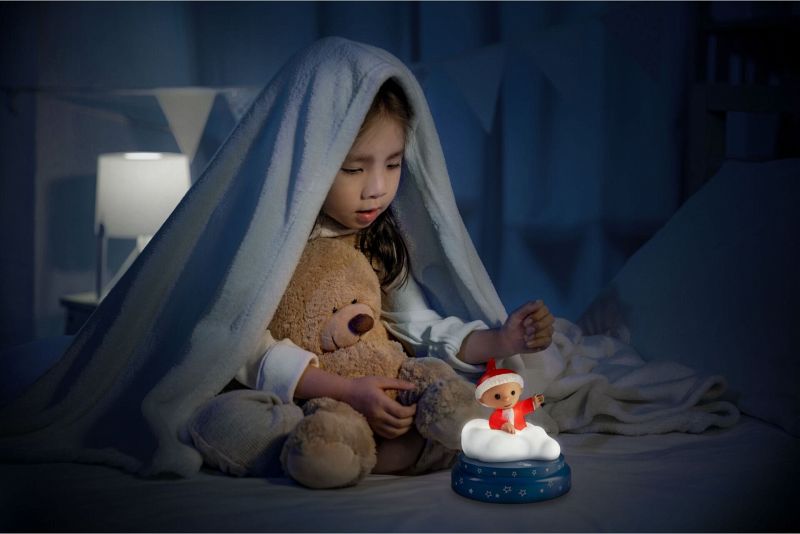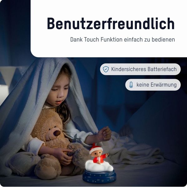 Das Nachtlicht ist über den Berührungssensor einfach zu bedienen. Dank Batteriebetrieb kann das Sandmännchen auch auf Reisen mitgenommen werden und sorgt so für eine vertraute Umgebung.