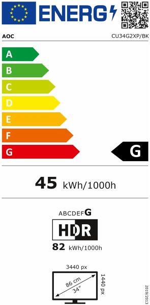 Marke: AOCModellkennung: CU34G2XP/BKEnergieeffizienzklasse von A (höchste Effizienz) bis G (niedrigste Effizienz): GLeistungsaufnahme im Ein-Zustand (kWh/1000h): 45Energieeffizienzklasse im HDR-Modus von A (höchste Effizienz) bis G (niedrigste Effizienz): GLeistungsaufnahme im Ein-Zustand im HDR-Modus (kWh/1000h): 82Sichtbare Bildschirmdiagonale (cm): 86Sichtbare Bildschirmdiagonale (Zoll): 34Bildschirmauflösung (Pixel): 3440 x 1440