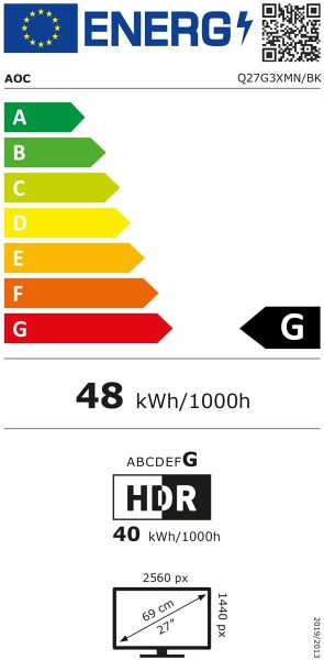 Marke: AOCModellkennung: Q27G3XMN/BKEnergieeffizienzklasse von A (höchste Effizienz) bis G (niedrigste Effizienz): GLeistungsaufnahme im Ein-Zustand (kWh/1000h): 48Energieeffizienzklasse im HDR-Modus von A (höchste Effizienz) bis G (niedrigste Effizienz): GLeistungsaufnahme im Ein-Zustand im HDR-Modus (kWh/1000h): 40Sichtbare Bildschirmdiagonale (cm): 69Sichtbare Bildschirmdiagonale (Zoll): 27Bildschirmauflösung (Pixel): 2560 x 1440