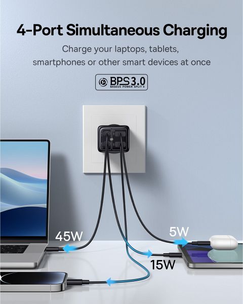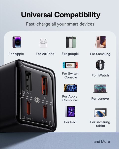 - Anzahl ladbarer Geräte: bis zu drei gleichzeitig. Dank des Multiport-Designs ist das Gerät ideal für Familie, Büro oder Reisen