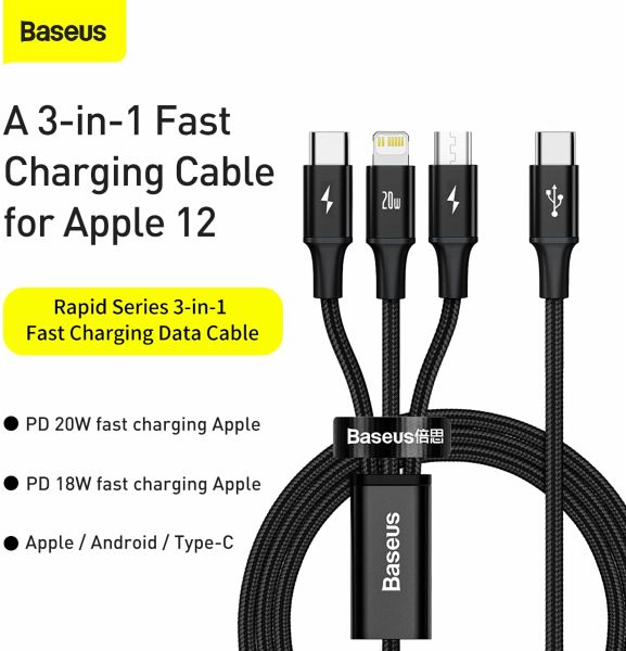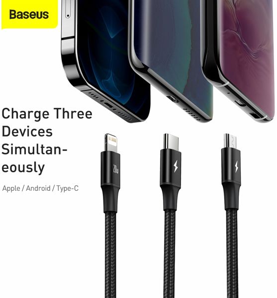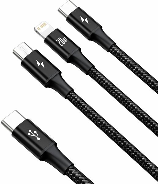Das Baseus Rapid Series 3-in-1 Kabel ist ein vielseitiges Schnellladekabel mit USB-C-Eingang und drei Ausgängen: Lightning, Micro-USB und USB-C. Es unterstützt Power Delivery mit bis zu 20 W und ermöglicht das gleichzeitige Laden von drei Geräten. Dank robuster Materialien wie geflochtenem Nylon und Aluminiumlegierung ist es besonders langlebig und widerstandsfähig.