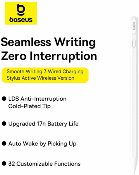 Der Baseus Smooth Writing 3 Wired Charging Stylus Active Wireless ist ein aktiver Eingabestift für iPads, der präzises Schreiben, Zeichnen und Navigieren ermöglicht. Er bietet eine lange Akkulaufzeit, magnetische Haftung und unterstützt kabelloses Laden. Mit 32 Funktionen und Palm-Rejection ist er ideal für produktives Arbeiten und kreatives Gestalten.