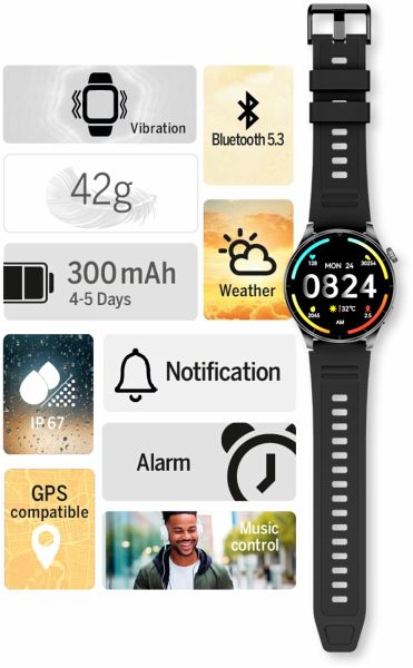 Die Bea-fon Watch 301 ist die perfekte Smartwatch für alle, die Wert auf einfache Bedienung und praktische Funktionen legen. Mit einem Lautsprecher und Mikrofon ermöglicht sie dir Bluetooth-Anrufe direkt über die Uhr, sodass du jederzeit in Kontakt bleibst. Das 1,45 Zoll AMOLED-Display sorgt für eine klare Anzeige, während die IP67-Zertifizierung Schutz vor Wasser und Staub bietet - ideal für den Alltag. Dank Funktionen wie Sportmodi, Musiksteuerung und Benachrichtigungen bleibt die Bea-fon Watch 301 der perfekte Begleiter für ein aktives und vernetztes Leben.