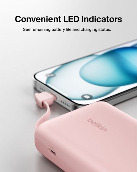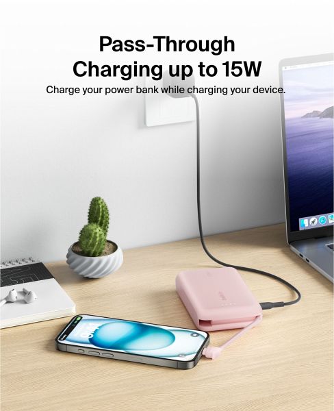 Laden Sie Geräte mit dieser leichten 10K-Powerbank mit bis zu 20 W auf. Da das USB-C-Kabel integriert ist, können Sie unterwegs bequem laden, ohne ein zusätzliches Kabel mitnehmen zu müssen. Dank des USB-C-Anschlusses kann gleichzeitig ein zweites Gerät aufgeladen werden.