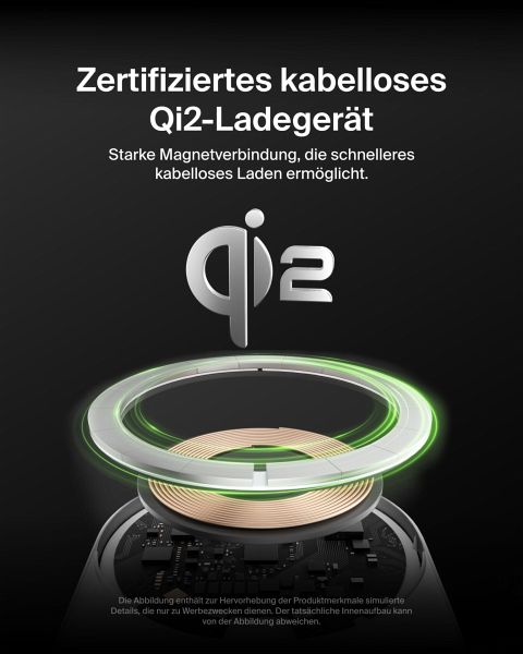 - Qi2-Ladegerät ist auf die Verwendung mit MagSafe-kompatiblen Hüllen ausgelegt