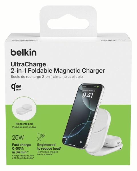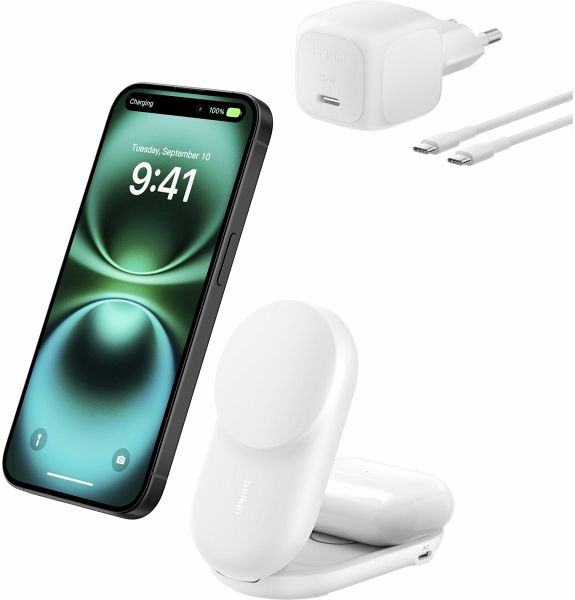 Belkin UltraCharge Faltbare magnetische 2-in-1-Ladestation mit Qi2 25W / Form: Rund / Weiß