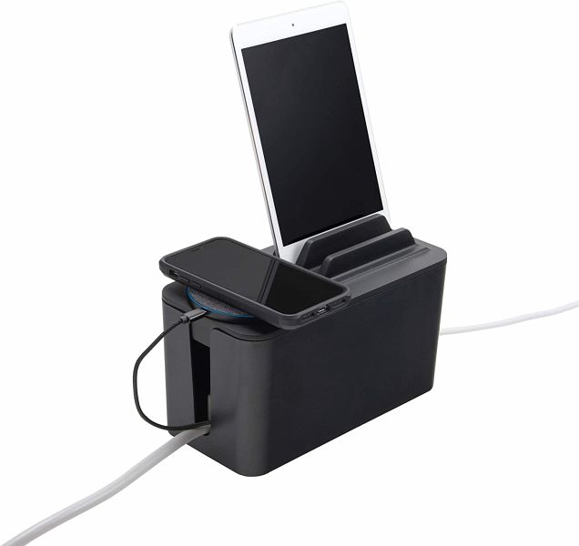 Die bluelounge CableBox Mini Station ist ein wahres Organisationstalent wenn es um das Verstecken von losen Kabeln am Arbeitsplatz geht. Sie kann ganz einfach eingesetzt werden und lässt in sekundenschnelle das Chaos verschwinden. Eine Steckerleiste kann einfach eingesetzt und die Box mit dem Deckel verschlossen werden. Durch das Bündeln mehrerer Kabel an einem Platz kann Hitze entstehen, deshalb besteht die Box auch aus schwer entflammbarem Plastik. Alle Kabel können durch zwei Öffnungen an beiden Seiten ordentlich nach Außen geführt werden. Die kleinen Gummifüße an der Unterseite verhindern das Verrutschen der Box. Ein integrierter Geräteständer am Deckel bietet Platz für Smartphones, Notebooks oder Tablets.