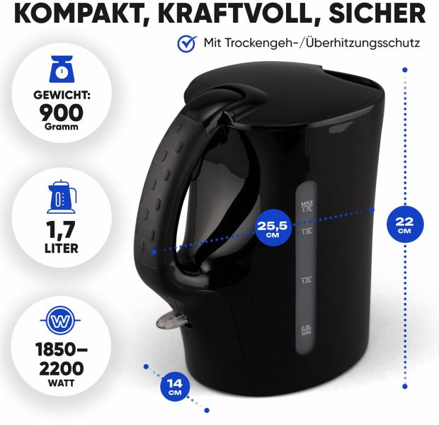 - Der Wasserkocher bietet Ihnen eine Kapazität von 1,7 Liter. Die Füllmenge können Sie anhand der zwei außenliegenden Wasserstandsanzeigen ablesen