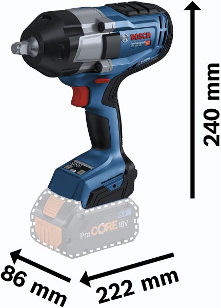 Der Drehschlagschrauber ist perfekt für Metallanwendungen mit Maschinenschrauben von M 10 bis M 24 wie Stahlbaukonstruktionen, Metallverbindungen, Rohrmontage, LKW-Instandhaltung, und Holzkonstruktionen. Er ist kompatibel mit allen Bosch Professional 18V-Akkus und -Ladegeräten (Professional 18V System); für maximale Leistung ProCORE18V ≥ 5,5 Ah verwenden.