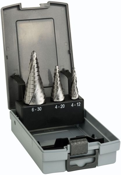 HSS-Stufenbohrerset dreiteilig mit 3-Flächen-Schaft für Bohrmaschinen und Schrauber