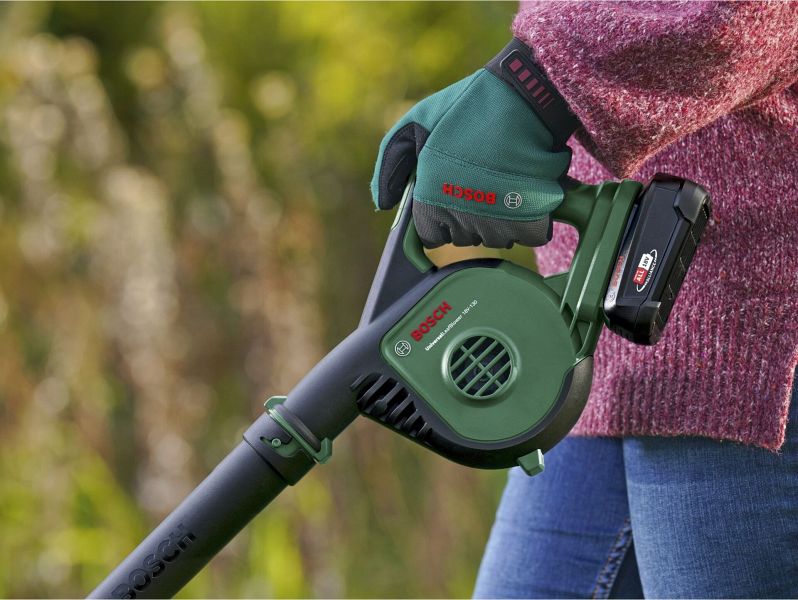 Einfache Beseitigung von Gartenabfällen mit dem kabellosen UniversalLeafBlower 18V-130. Der leichte und kompakte Laubbläser verfügt über einen ergonomischen Griff und lässt sich mühelos in die hintersten Ecken des Gartens tragen. Er besitzt einen einfachen Schalter mit 2 Geschwindigkeitsstufen zur Luftstromsteuerung für wahlweise kraftvolleres oder kontrollierteres Säubern. Der Bosch 18V POWER FOR ALL-Akku und die Syneon Technology sorgen für eine beeindruckende Luftstromgeschwindigkeit von 245 km/h für schnelles und kraftvolles Säubern. Mehrere Düsenaufsätze sorgen für vielseitige Flexibilität beim Säubern des Gartens. Der Laubbläser lässt sich leicht zusammenbauen und kompakt lagern, und er läuft mit einer Akkuladung bis zu 18 Minuten. Die eingebaute Bosch Syneon Electronic schützt das Gerät und den Akku. Das Gerät ist Teil des 18V POWER FOR ALL-Systems. Ein einziger Akku kann für alle 18V POWER FOR ALL-Werkzeuge verwendet werden.