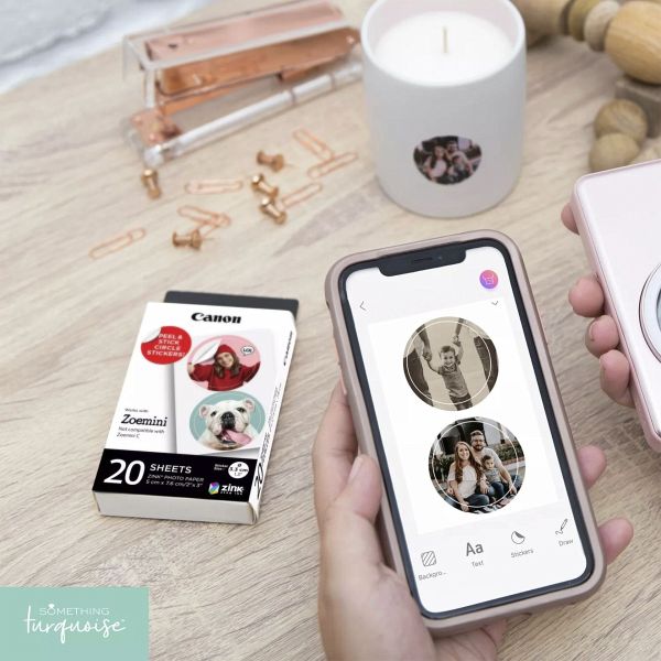 Einfach das ZINK Fotopapier mit den vorgestanzten runden Stickern in einen Canon Zoemini einlegen und dann die Schnappschüsse vom Handy oder Tablet in begehrte Andenken, Geschenke und Dekorationen verwandeln. Die innovative Technologie des ZINK Fotopapiers sorgt in perfekter Größe sofort für wisch-, wasser- und reißfeste Fotos - ganz einfach und ganz ohne Tinte. Das ist ideal zum Drucken unterwegs. Die Prints lassen sich fast überall verwenden - einfach die Schutzfolie auf der Rückseite abziehen und auf das Handycover, den Laptop oder eine Wasserflasche aufkleben. Noch persönlicher geht es kaum.