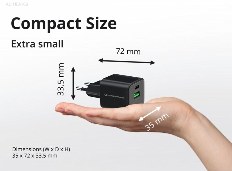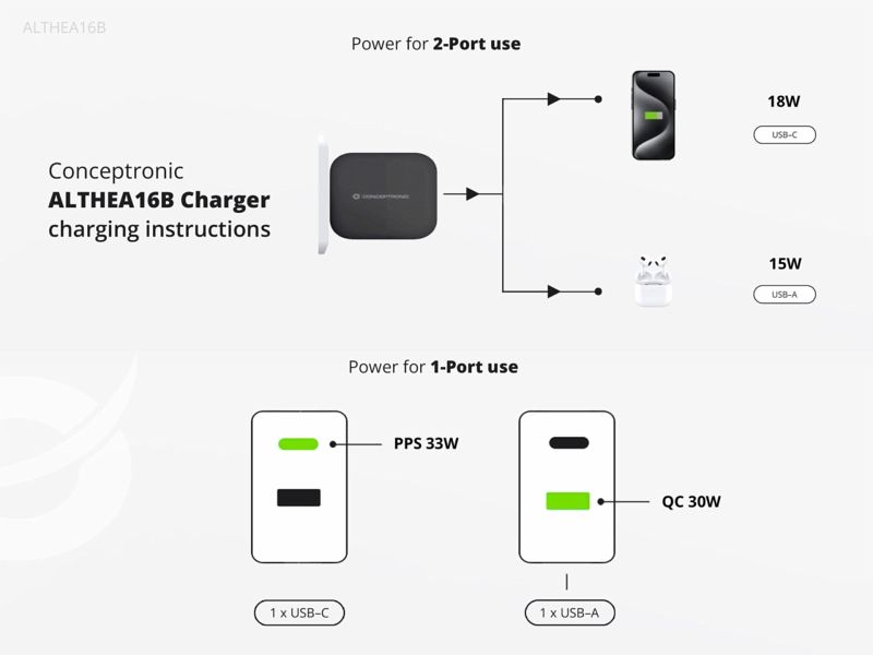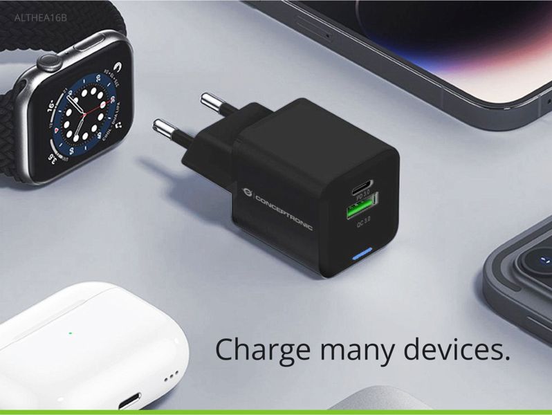Das ALTHEA16W 2-Port 33W GaN USB PD Ladegerät** von Conceptronic ist ein kompaktes und leistungsstarkes Ladegerät mit GaN für effizientes und schnelles Laden. Es verfügt über zwei Anschlüsse (USB-C und USB-A) mit Power Delivery (PD) 3.0 und Quick Charge (QC) 3.0. Dank integrierter Schutzmechanismen gegen Überlastung, Kurzschluss und Überhitzung ist es besonders sicher und zuverlässig.
