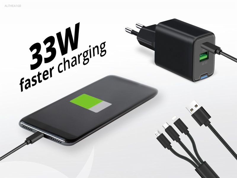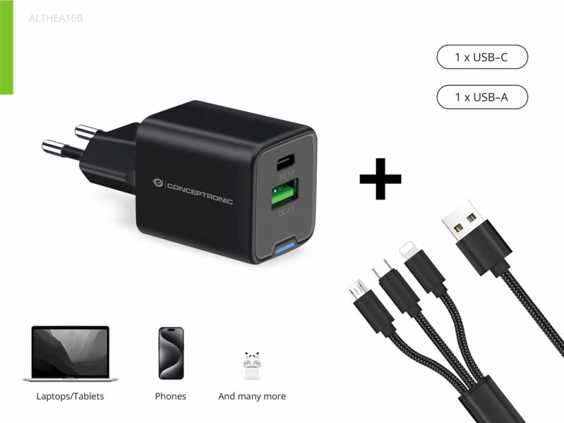 Conceptronic ALTHEA16B, 2-Port GaN 33 Watt PD USB-Ladegerät + 3-in-1 Ladekabel, schwarz