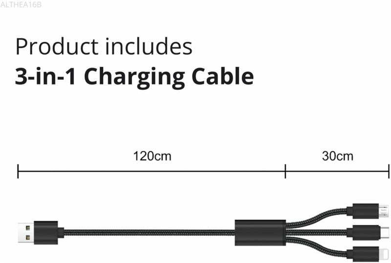 - Enthält ein 1,5 m langes 3,0A 3-in-1-Kabel (Micro-USB, USB-C, Lightning 8-Pin)