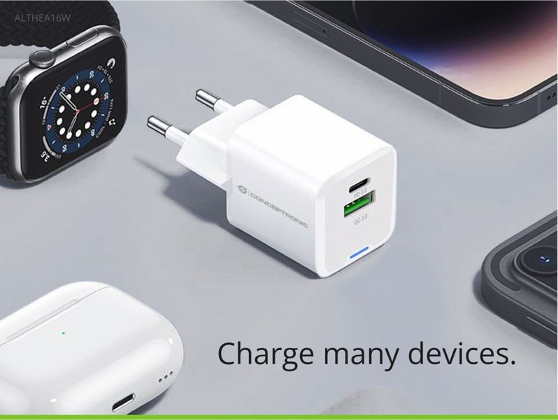 Das ALTHEA16W 2-Port 33W GaN USB PD Ladegerät** von Conceptronic ist ein kompaktes und leistungsstarkes Ladegerät mit GaN für effizientes und schnelles Laden. Es verfügt über zwei Anschlüsse (USB-C und USB-A) mit Power Delivery (PD) 3.0 und Quick Charge (QC) 3.0. Dank integrierter Schutzmechanismen gegen Überlastung, Kurzschluss und Überhitzung ist es besonders sicher und zuverlässig.