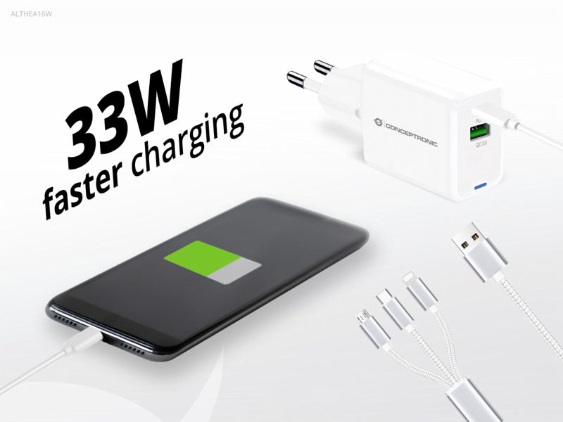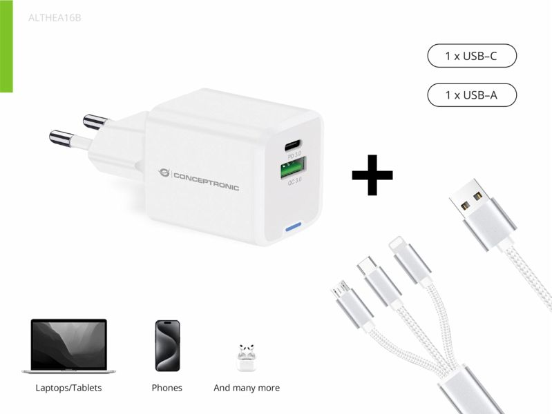 Conceptronic ALTHEA16W, 2-Port GaN 33 Watt PD USB-Ladegerät + 3-in-1 Ladekabel, weiß